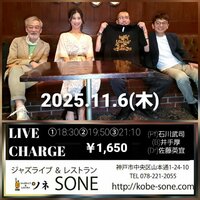 2025年11月06日(木) 三宮JAZZライブ&レストランソネ 18:30〜19:50〜21:10 ¥1650 (Pf)石川武司 (B)井手厚 (Dr)佐藤英宜 兵庫県神戸市中央区中山手通1丁目24-10 078-221-2055 | |