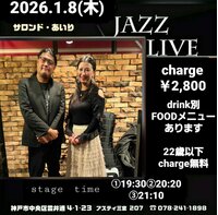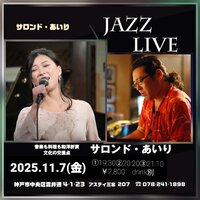 2025年11月07日(金) 三宮サロン・ド・あいり 19:30〜20:20~21:10~ ¥2800 drink別 (Pf)おーたかずお 兵庫県神戸市中央区雲井通4-1-17 アスティ三宮207 078-241-1898 | |