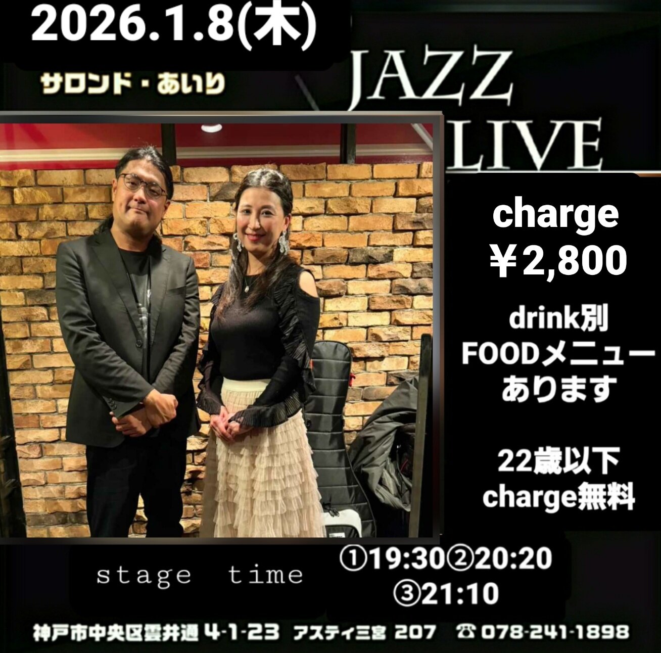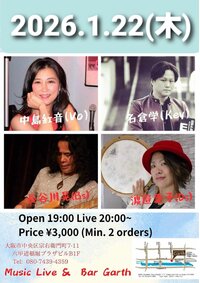 2026年01月08日(木) 三宮サロン・ド・あいり 19:30〜20:20~21:10~ ¥2800 drink別 (Gt)田村太一 兵庫県神戸市中央区雲井通4-1-17 アスティ三宮207 078-241-1898 | |