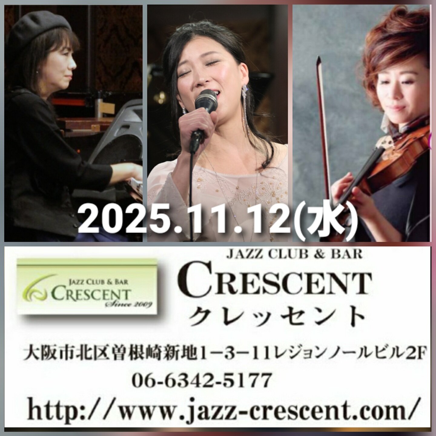 2025年11月12日(水) 北新地クレッセント 19:30〜21:00〜22:00〜 ¥2200 (Pf)飛騨峰代 (Vi)藤井道子 大阪市北区曽根崎新地1-3-11 レジョンノールビル2F 06‐6342‐5177 | |