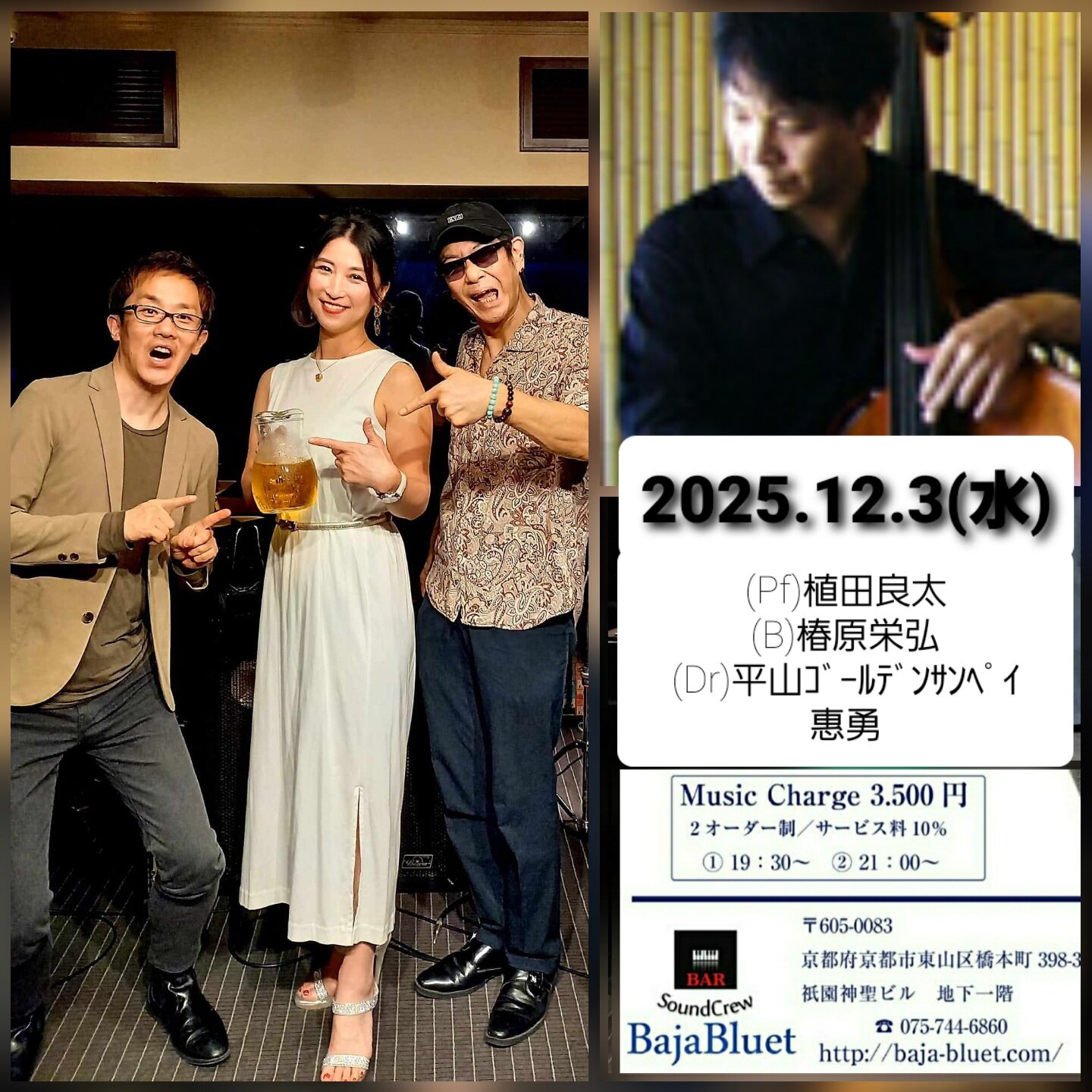 2025年12月03日(水) 祇園バハ ブラット 19:30〜2set ¥3500 2オーダー制 (Pf)植田良太 (B)椿原栄弘 (Dr)平山サンペイ恵勇 京都府京都市東山区橋本町398-3 祇園神聖ビル 地下一階 075-744-6860 | |