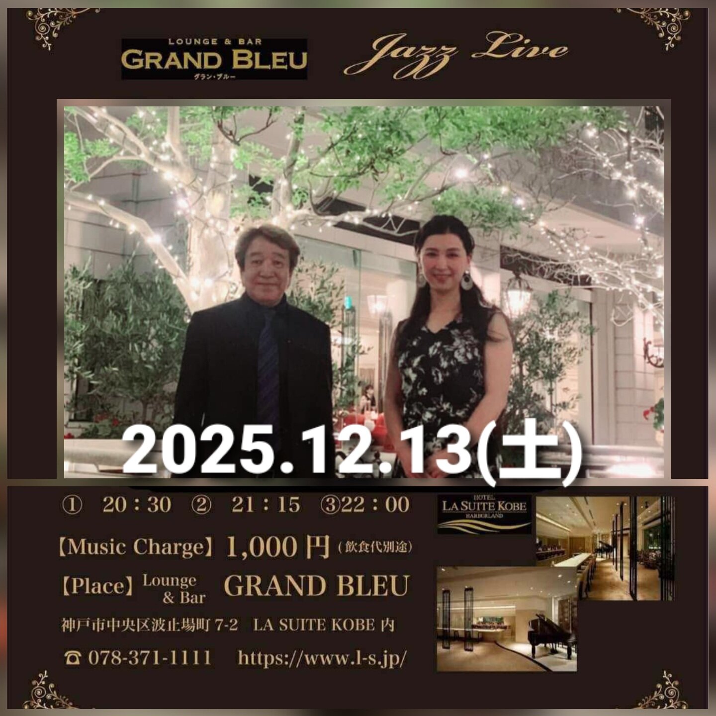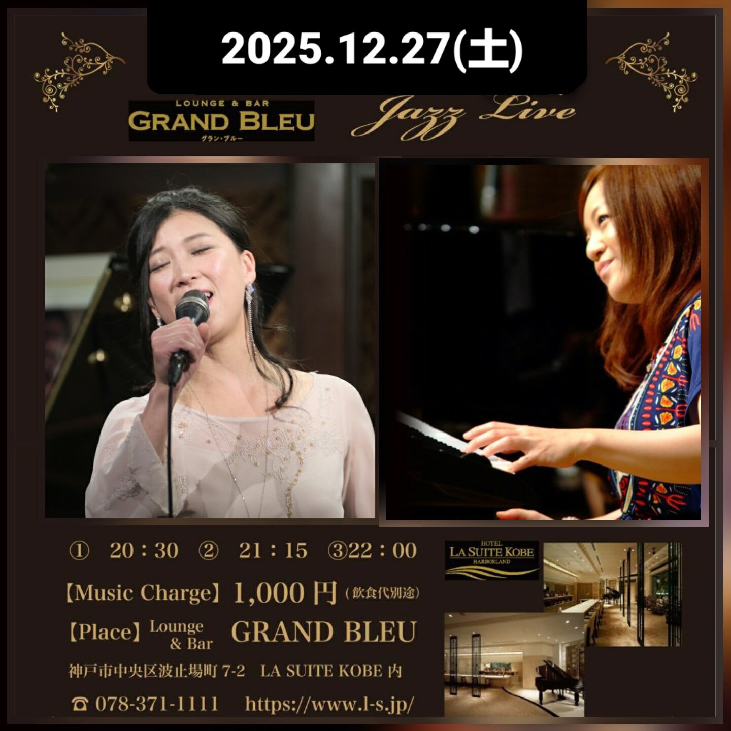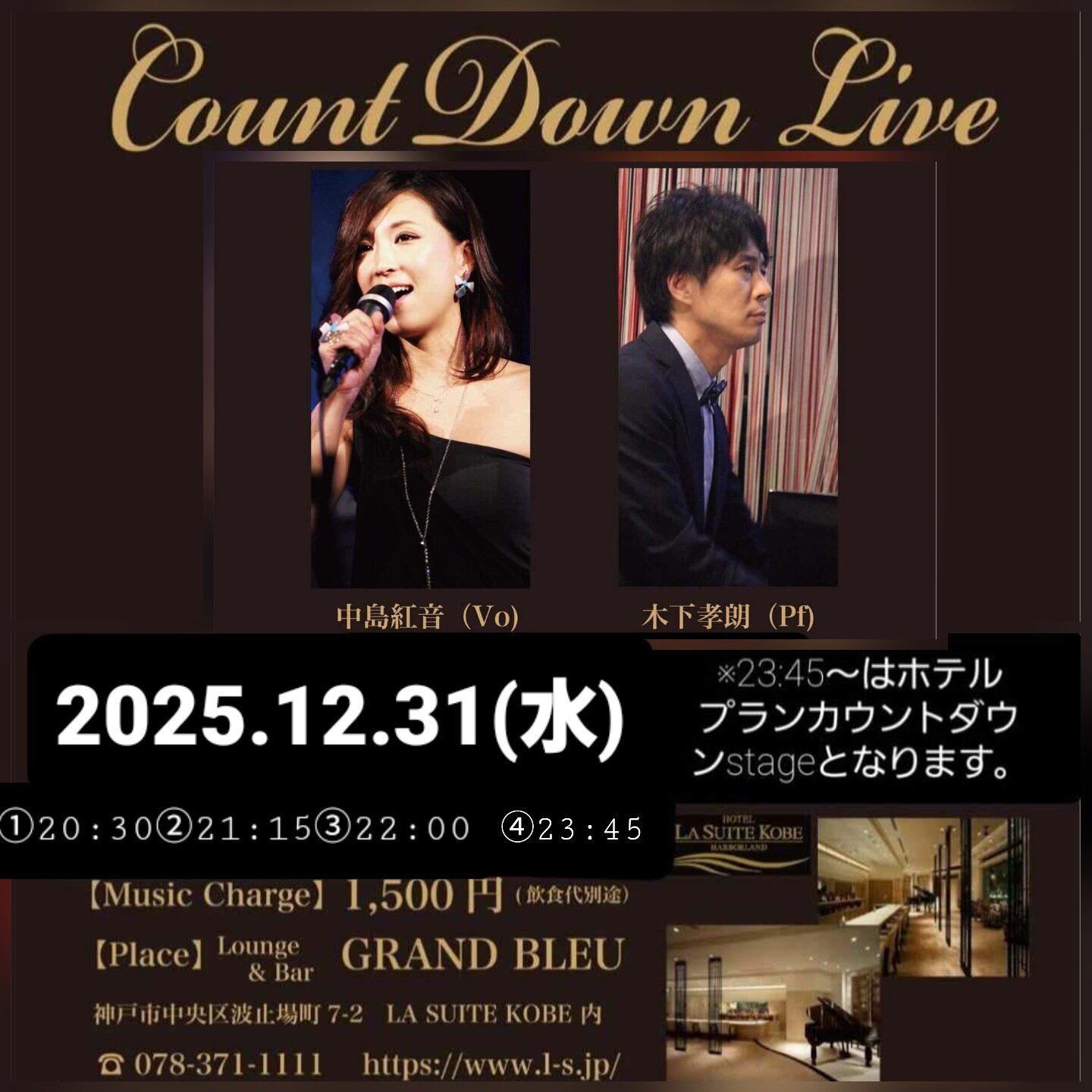 2025年12月31日(水) ラ・スイート神戸 グランブルー カウントダウンライブ 20:30~21:15~22:00~23:45~ ¥1500 23:45~ホテルプランカウントダウンstage (Pf)木下孝朗 神戸市中央区波止場町7-2 078-371-1111 | |
