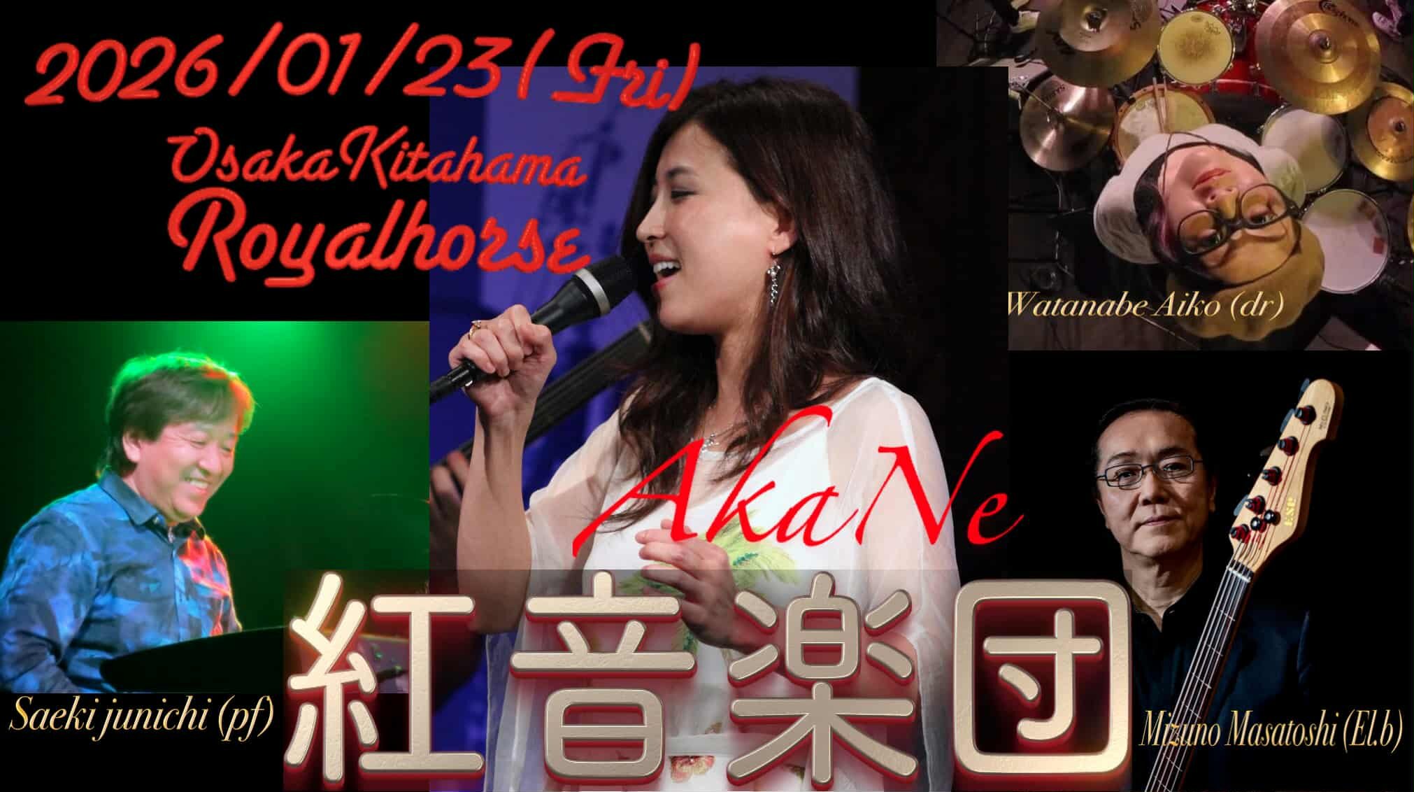 2026年01月23日(金) 北浜ロイヤルホース『紅音楽団』 19:00〜20:30~(Open 18:00) ¥3850 (Pf)佐伯準一 (Ba)水野正敏 (Dr)渡邉愛子 大阪市中央区北浜1-1 ビルマビル北浜11階 06-6312-8958 | |